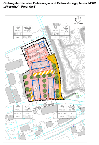 Der Planungsvorentwurf des Bebauungsplanes mit integriertem Grünordnungsplan und grünordnerische Konzept der mks Architekten-Ingenieure GmbH, Mühlenweg 8, 94347 Ascha, in der Entwurfsfassung vom 14.11.2023 wurde in der Gemeinderatssitzung vom 21.11.2023 gebilligt und die Auslegung der Satzungsunterlagen des Bebauungsplanes mit integriertem Grünordnungsplan MDW „Wiererhof - Freundorf“ mit Einleitung der Öffentlichkeitsbeteiligung nach § 3 Abs. 2 BauGB sowie der Beteiligung der Behörden und sonstigen Träger öffentlicher Belange nach § 4 Abs. 2 BauGB beschlossen.